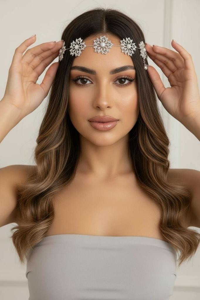 Saf beyaz tonlu metal altyapısı sayesinde hem klasik hem de modern gelinliklerle mükemmel uyum sağlar. Çiçek motifleri, doğadan ilham alan zarif bir görünüm kazandırırken, ince işçilik detayları aksesuarın şıklığını ön plana çıkarır.