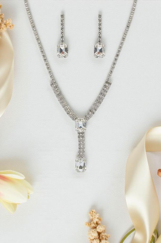 Accessories Kare Taşlı Kolye ve Küpe Düğün, Kına, Nişan Gelin 2'li Takı Seti
