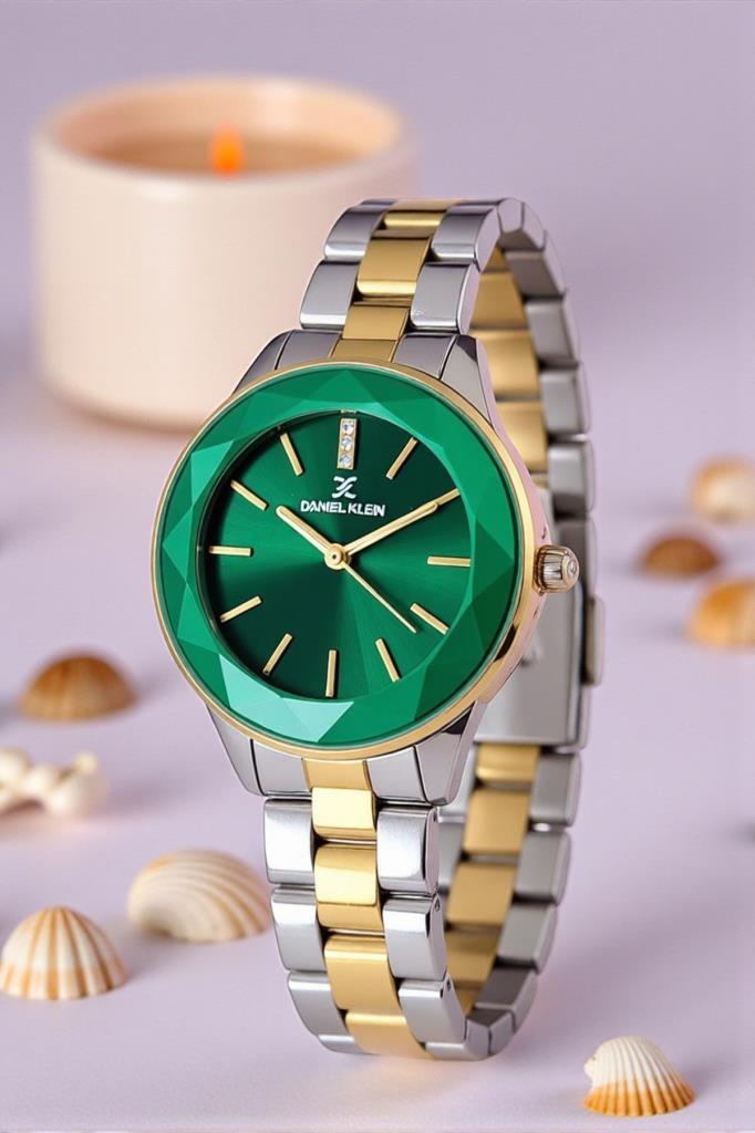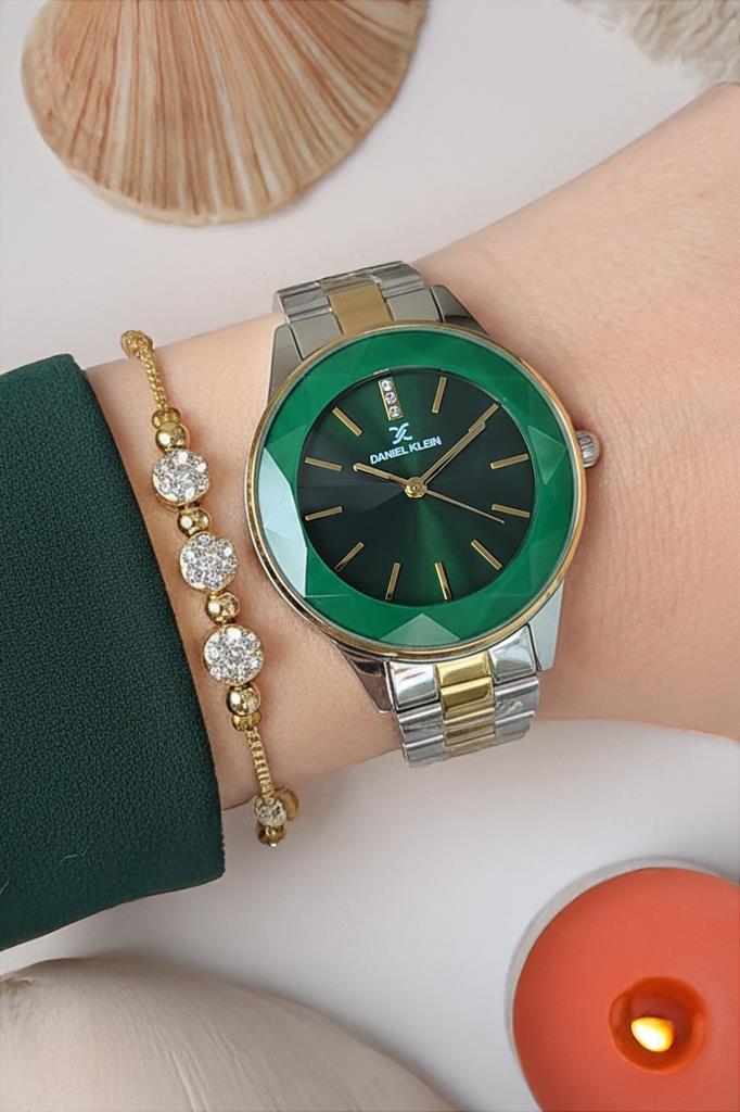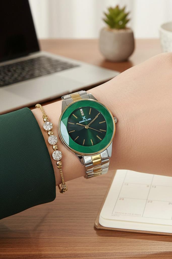 Canlı yeşil kadranı ve altın–metalik detaylarıyla öne çıkan Daniel Klein kadın kol saati, modern tasarımı klasik zarafetle buluşturur. 36 mm kasa çapı, bilekte zarif ve dengeli bir duruş sağlarken, yuvarlak kasa formu her stile uyum sağlayan zamansız bir görünüm sunar.