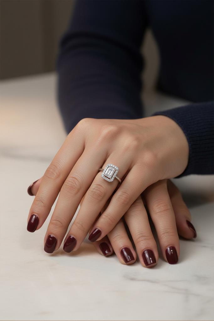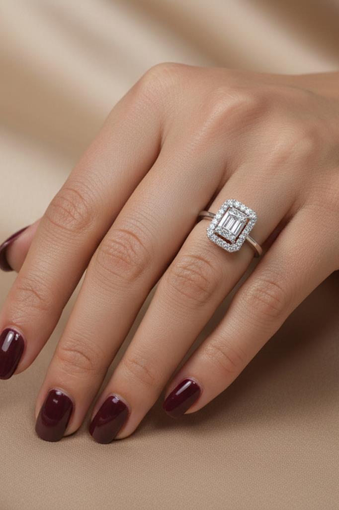 Baget kesim taş detayı ve zarif çerçeve tasarımıyla öne çıkan bu şık yüzük, klasik tek taş zarafetini modern çizgilerle buluşturur. Merkezde yer alan dikdörtgen formdaki taş, çevresini saran parlak taş detaylarıyla birlikte yüzüğe güçlü ve sofistike bir ışıltı kazandırır.
