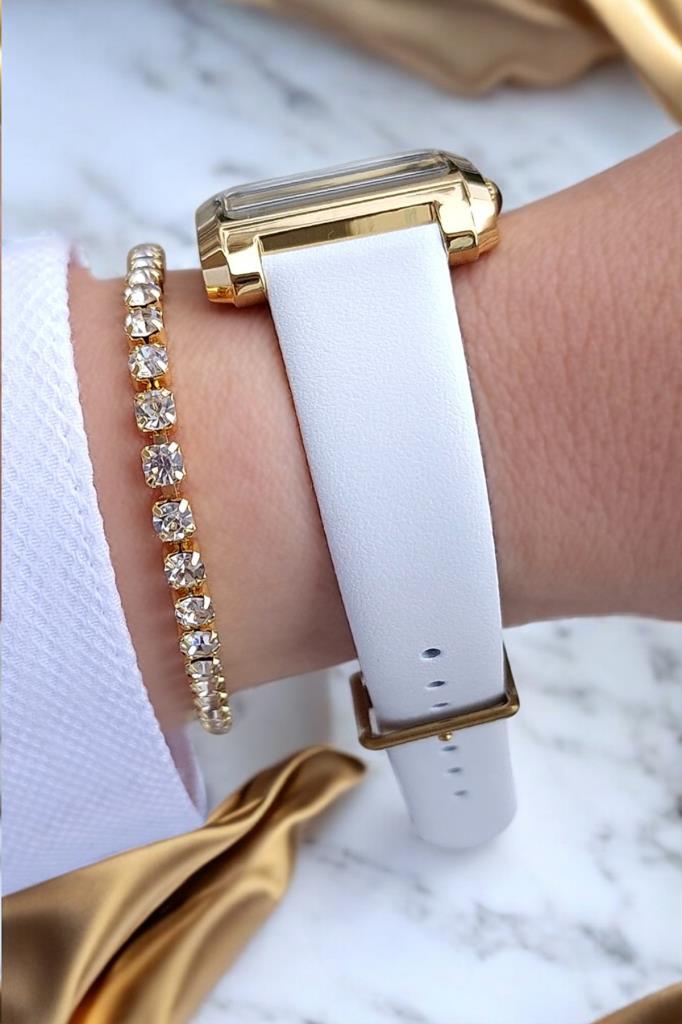Beyaz Deri Kayışlı Altın Sarısı Dikdörtgen Kasa Kadın Kol Saati, Taşlı Bileklik Hediyeli