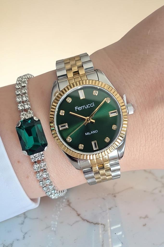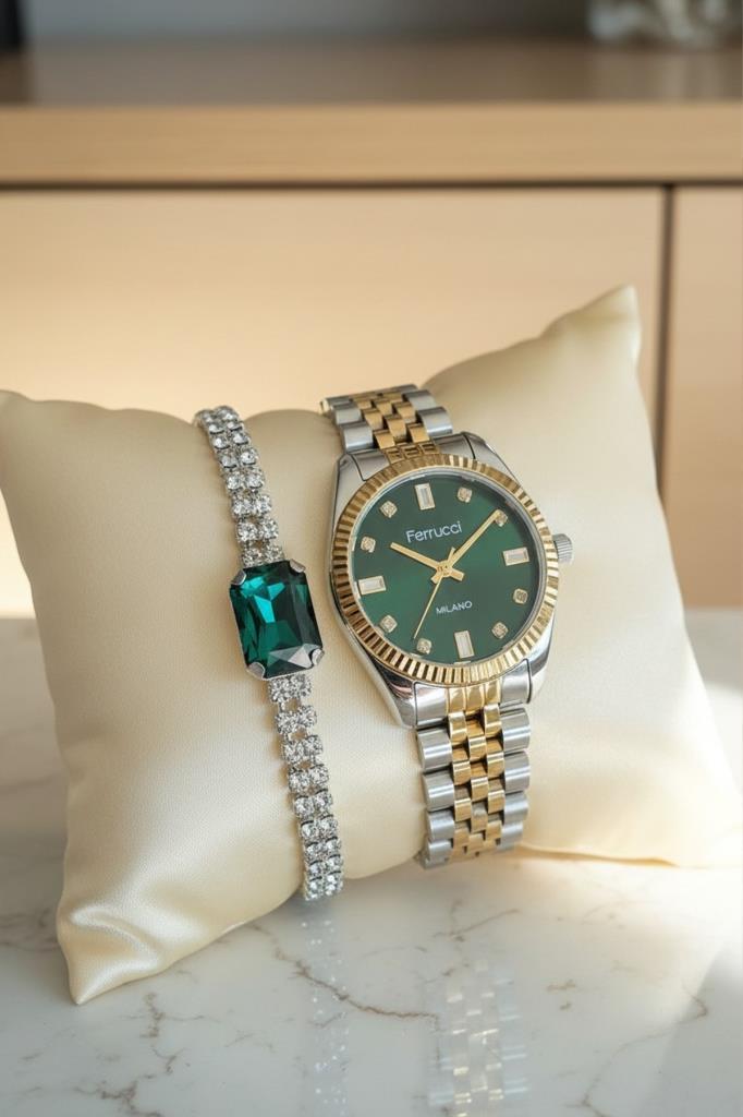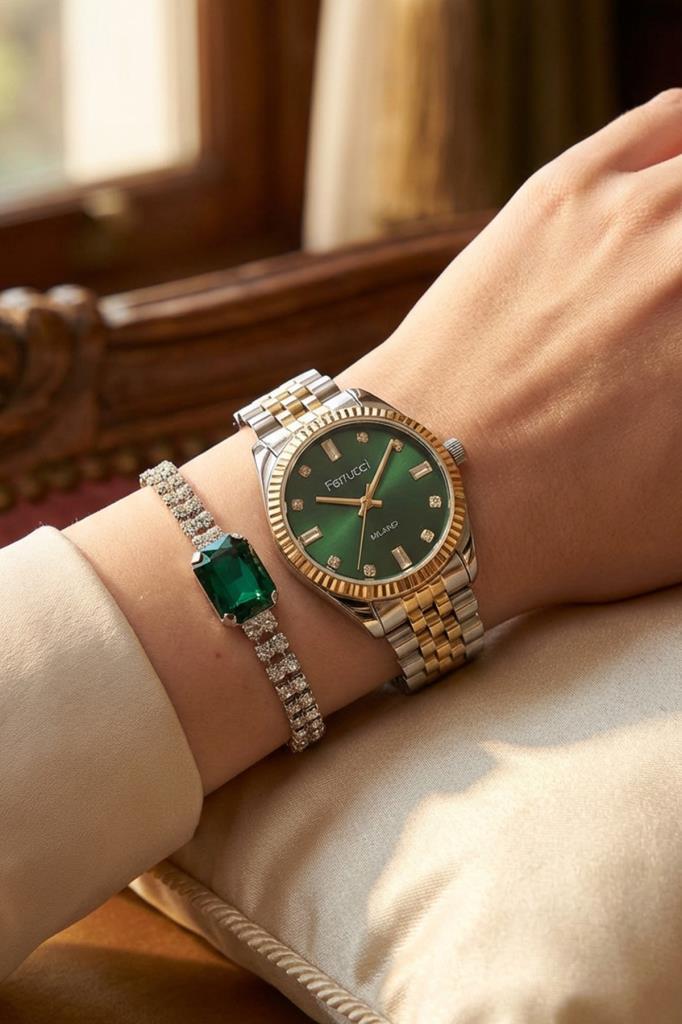 Şık tasarımı, yeşil kadranı ve zarif metal kordonu ile bu kadın kol saati doğum günü, sevgililer günü ve özel günler için ideal bir hediye alternatifidir.