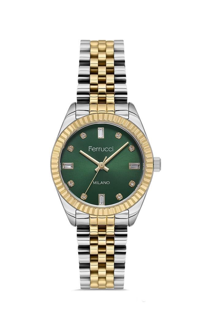 Zarif ve dikkat çekici tasarımıyla öne çıkan bu 35 mm kadın kol saati, modern detayları ve şık renk uyumuyla günlük kullanım için ideal bir modeldir. İki renkli metal kasa ve çelik kordon tasarımı hem klasik hem de modern kombinlerle uyum sağlar. Yeşil tonlu kadranı ışığa göre farklı yansımalar oluşturarak saate sofistike ve göz alıcı bir görünüm kazandırır. Altın tonlu çerçeve ve taş detaylı indeksler tasarımı daha zarif hale getirir.