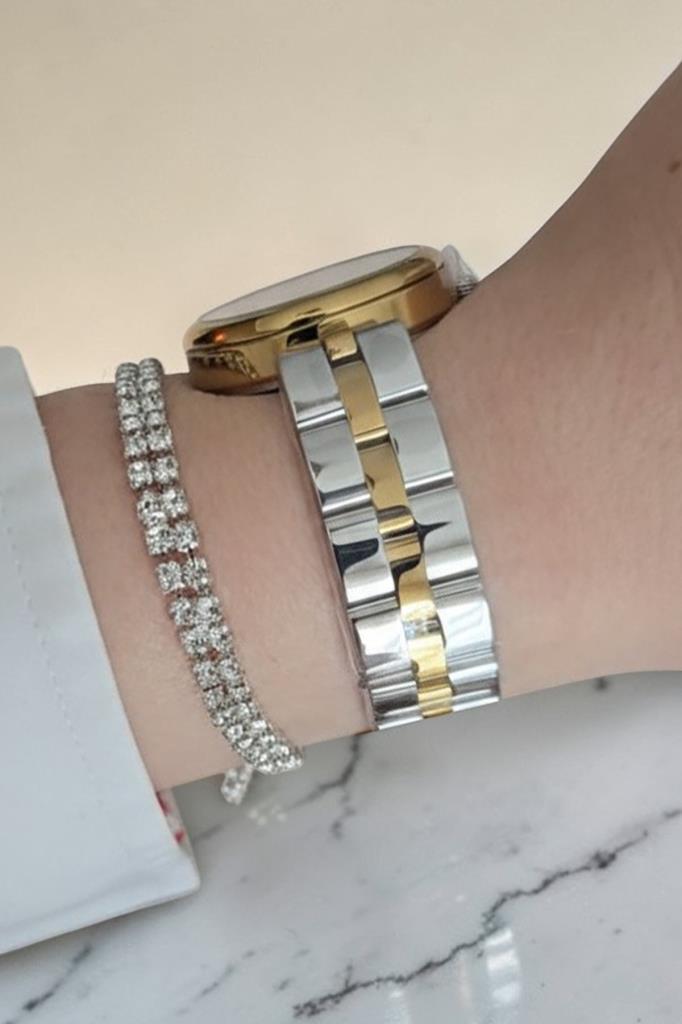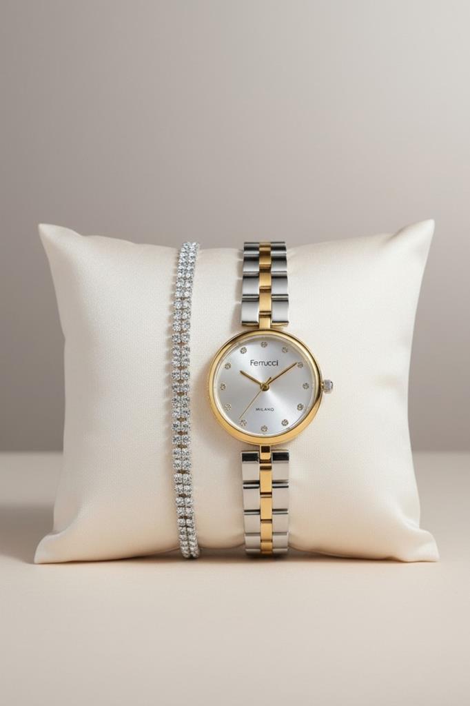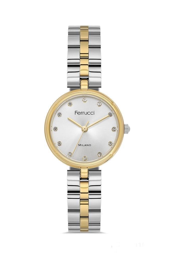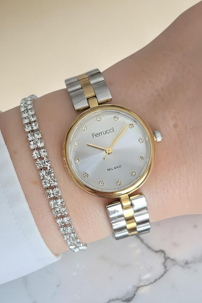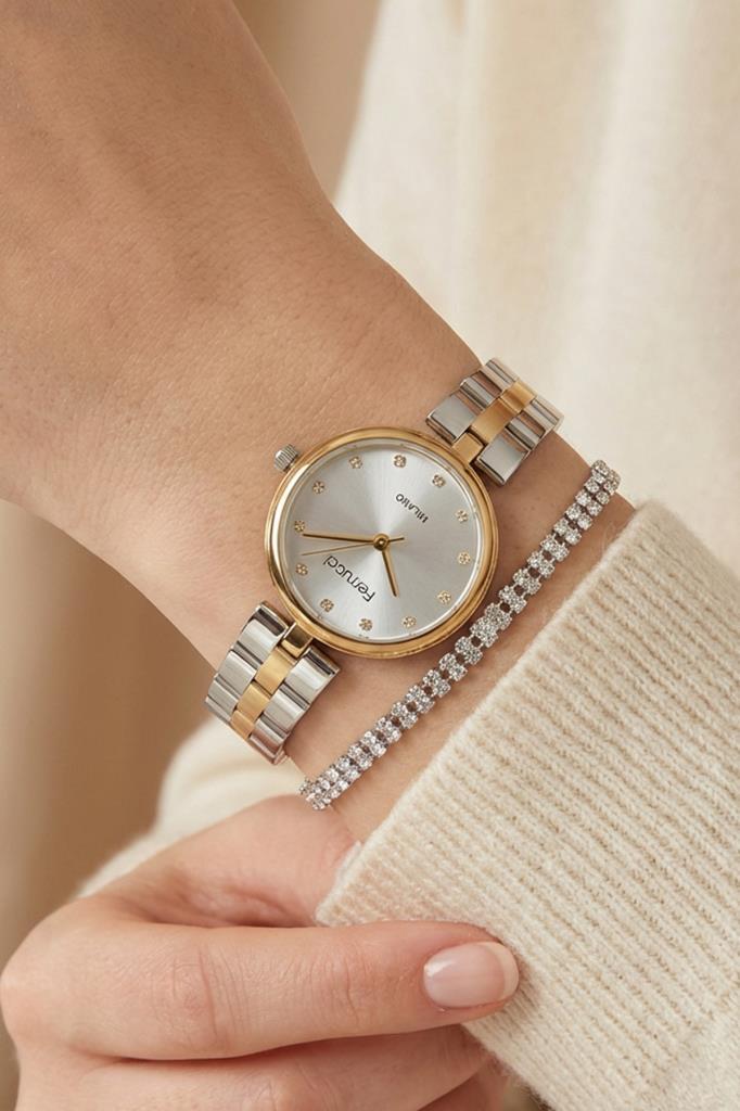 Şık tasarımı, taş detaylı kadranı ve iki renkli metal kordonu ile bu kadın kol saati hem günlük kullanım hem de hediye seçenekleri için ideal bir tercihtir.