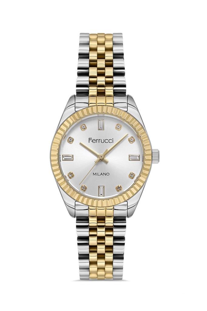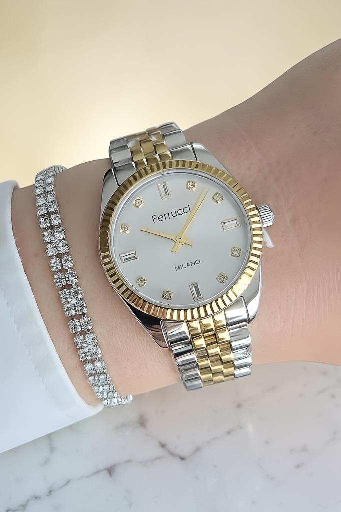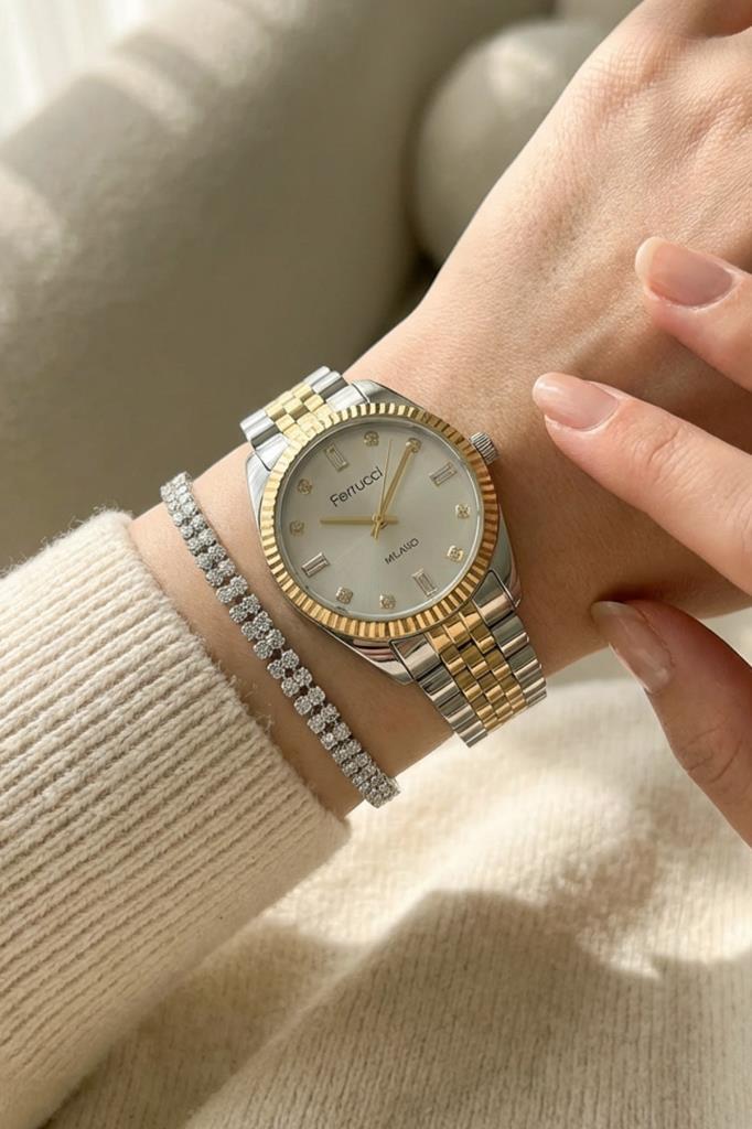 Zarif ve modern detaylarıyla dikkat çeken bu 35 mm kadın kol saati, şıklığı ve sade tasarımı bir araya getirerek günlük kullanım için ideal bir model sunar. İki renkli metal kasa ve çelik kordon tasarımı sayesinde hem klasik hem de modern kombinlerle kolayca uyum sağlar. Altın tonlu çerçevesi ve taş detaylı indeksleri saate zarif ve dikkat çekici bir görünüm kazandırır.