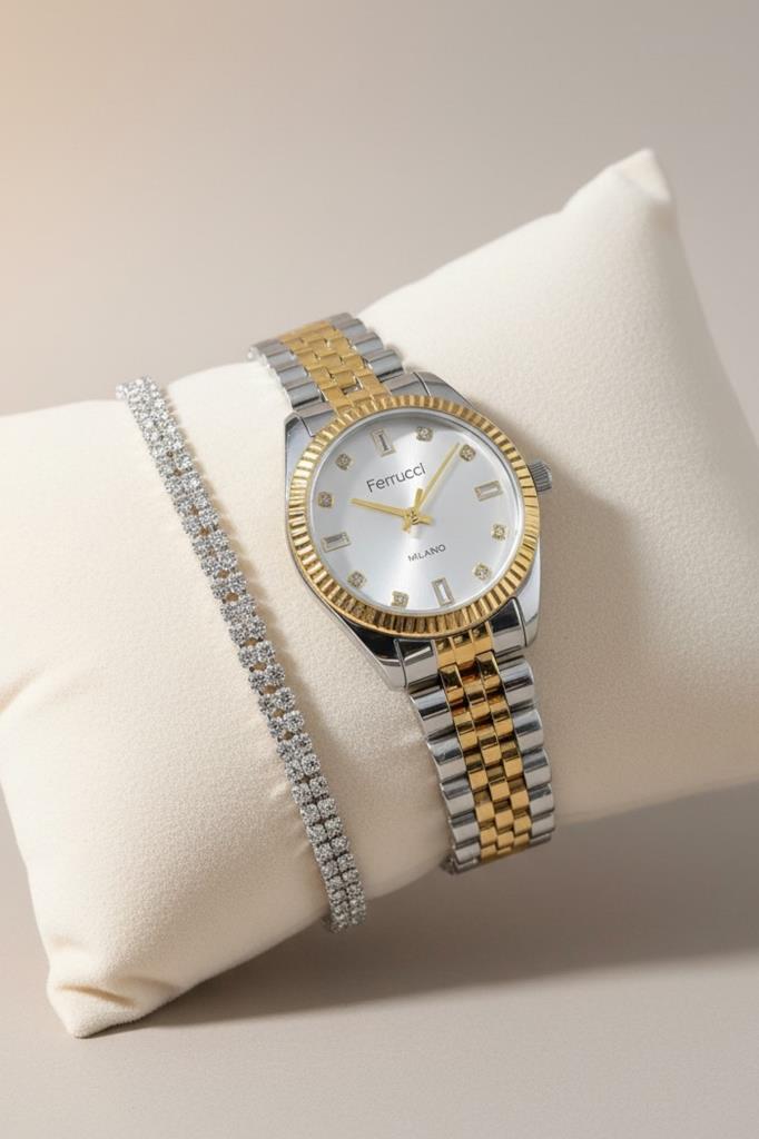 Zarif tasarımı, iki renkli metal kordonu ve bileklik hediyesi ile bu kadın kol saati doğum günü, sevgililer günü ve özel günler için şık bir hediye alternatifidir.