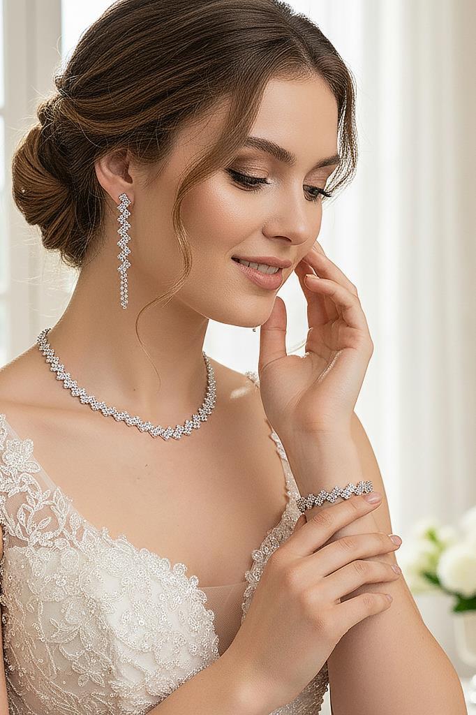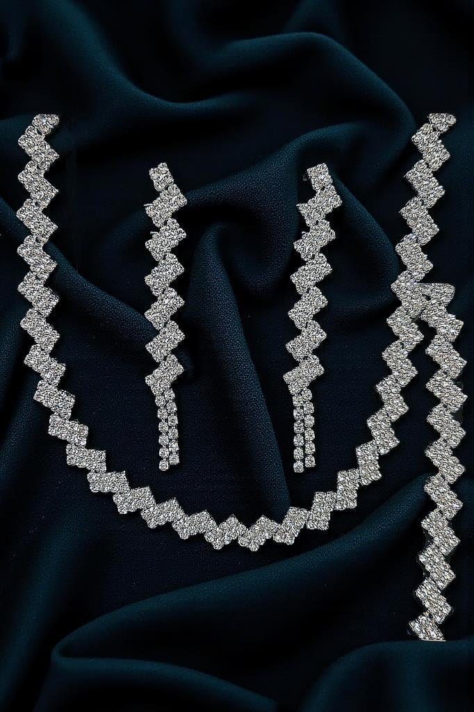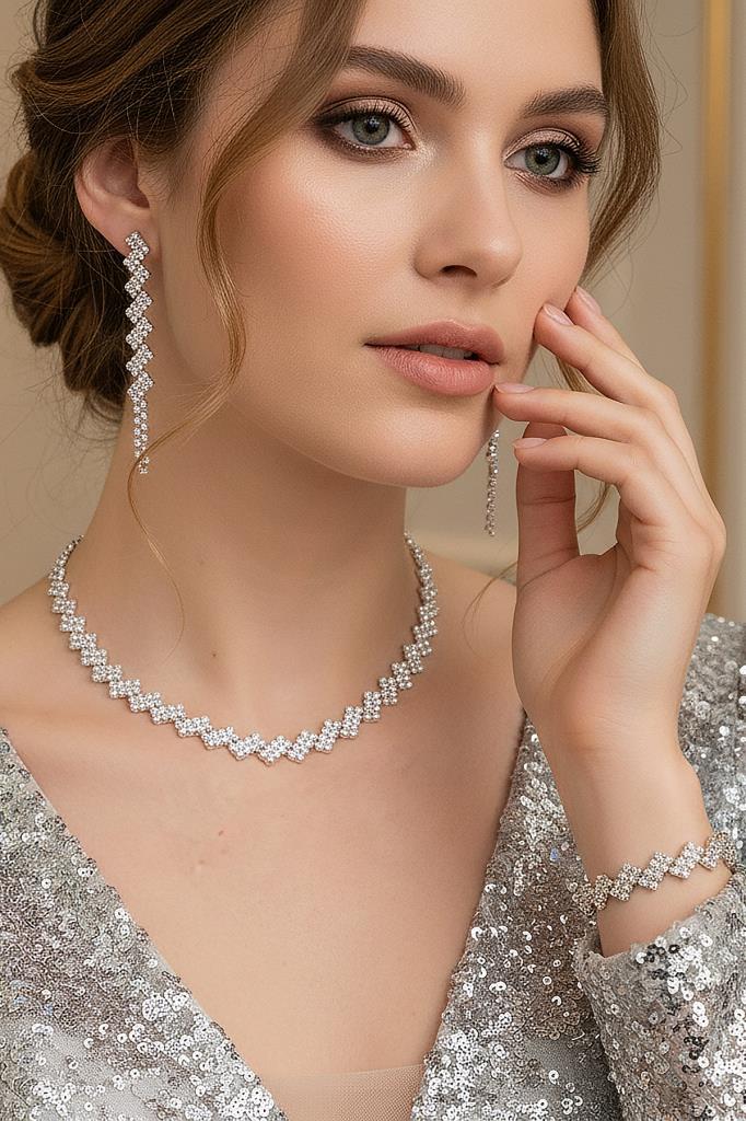 Çapraz Dizim Zirkon Taşlı 3’lü Kolye, Küpe ve Bileklik Seti - Düğün, Kına, Nişan Gelin Takı Seti