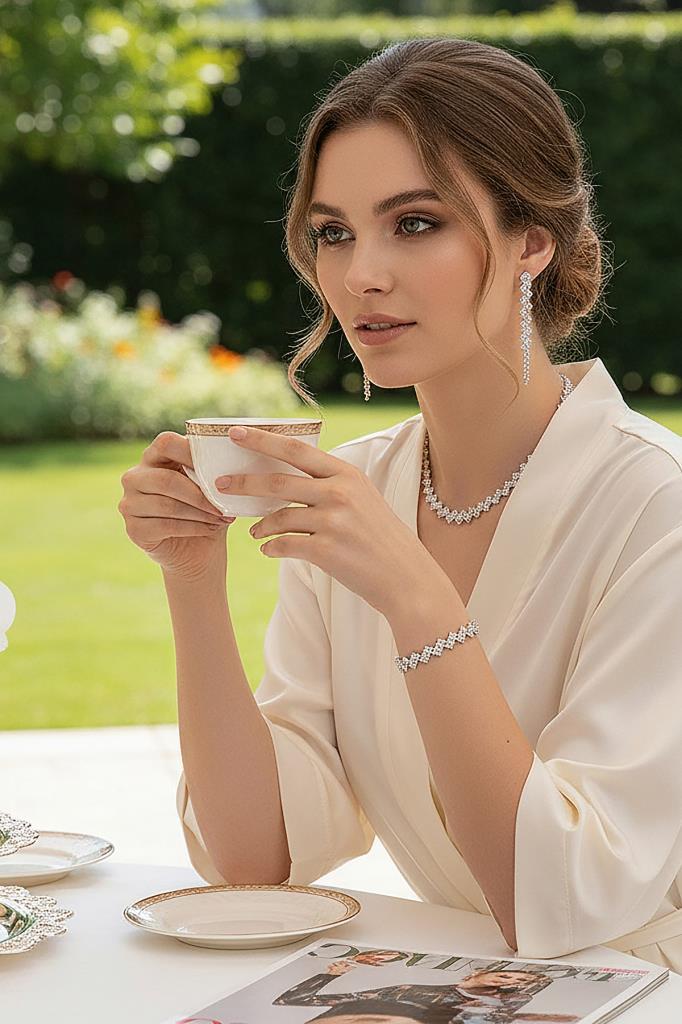Setin en özel detayı olan çapraz dizimli kolye tasarımı, choker formu ile boyun hattını belirgin ve zarif gösterir. Hem modern hem de gösterişli bir görünüm arayanlar için dengeli bir şıklık sunarken; zirkon taşlı küpe ve su yolu bileklik ile tamamlandığında bütüncül bir stil oluşturur.
