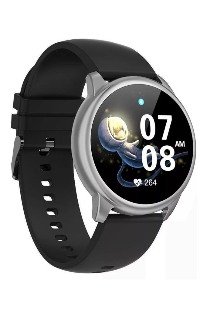 Şık tasarımıyla öne çıkan saat, siyah silikon kayışı sayesinde gün boyu rahat bir kullanım sunar. IP68 suya ve toza dayanıklılık ile her türlü hava koşulunda güvenle kullanılabilir; el/yüz yıkarken veya yağmurda endişe etmezsin. Kablosuz (wireless) şarj ile pratik şekilde şarj edilir ve ortalama 2 gün kullanım süresi sunar.Teknik detaylar: Saat yaklaşık 46 gram ağırlığındadır. Kasa ölçüsü 49 x 43 x 11.5 mm, kayış genişliği 21.5 mm’dir. Ekran çözünürlüğü 420 x 485 piksel olup net ve canlı bir görüntü sunar. Batarya kapasitesi 280 mAh’dir.