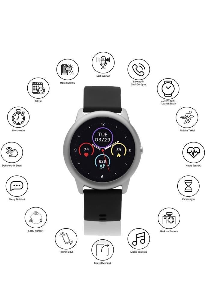 Kronometre, hesap makinesi gibi pratik özelliklerin yanında uzaktan müzik kontrolü, telefonu bul, hava durumu ve uzaktan kamera kontrolü gibi detaylarla günlük kullanımda büyük rahatlık sağlar. Dilersen Akıllı Saat Modu ile tüm fonksiyonları kullanır, dilersen Normal Saat Moduna geçerek daha sade bir deneyim yaşayabilirsin. Üstelik içerisinde 2 adet oyun ve 11 farklı menü stili bulunur.
