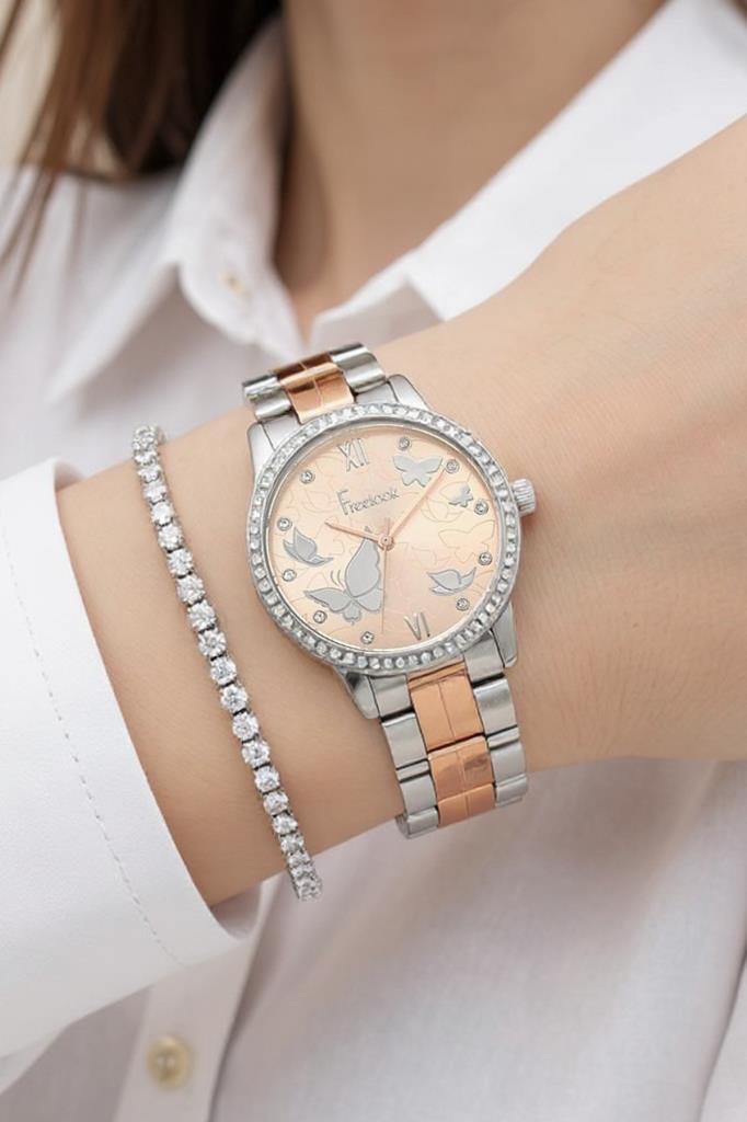 Freelook Kelebek Detaylı Rose Gold/Metalik Kadın Kol Saati, Taşlı Bileklik Hediyeli