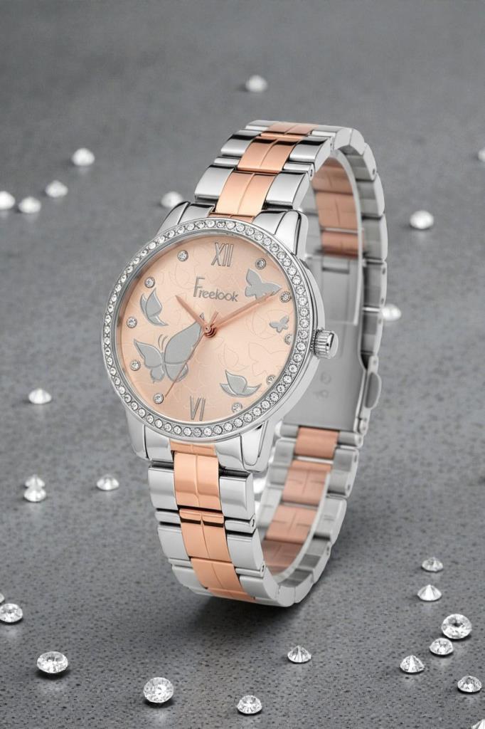 Freelook marka bu zarif kadın kol saati, 35 mm çelik kasası ve bicolor çelik kordonu ile feminen şıklığı modern detaylarla buluşturur. Rose renkli kadranı üzerinde yer alan kelebek desenleri ve taş detayları, saate sofistike ve dikkat çekici bir görünüm kazandırır. Analog ekran yapısı ve pilli mekanizması, günlük kullanımda pratik ve güvenilir bir deneyim sunar.