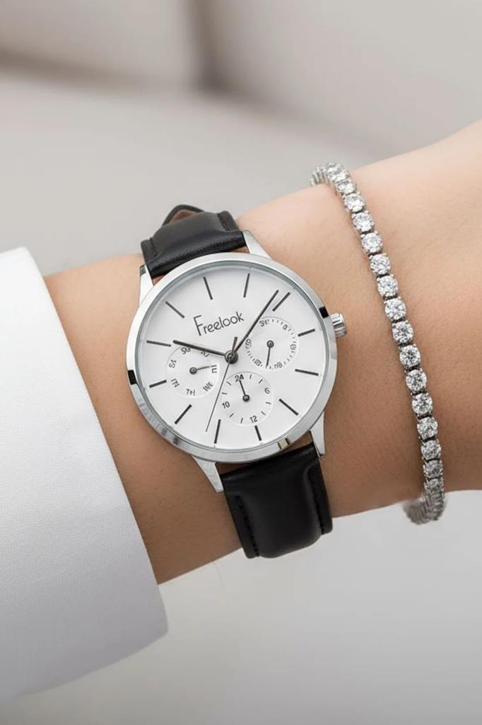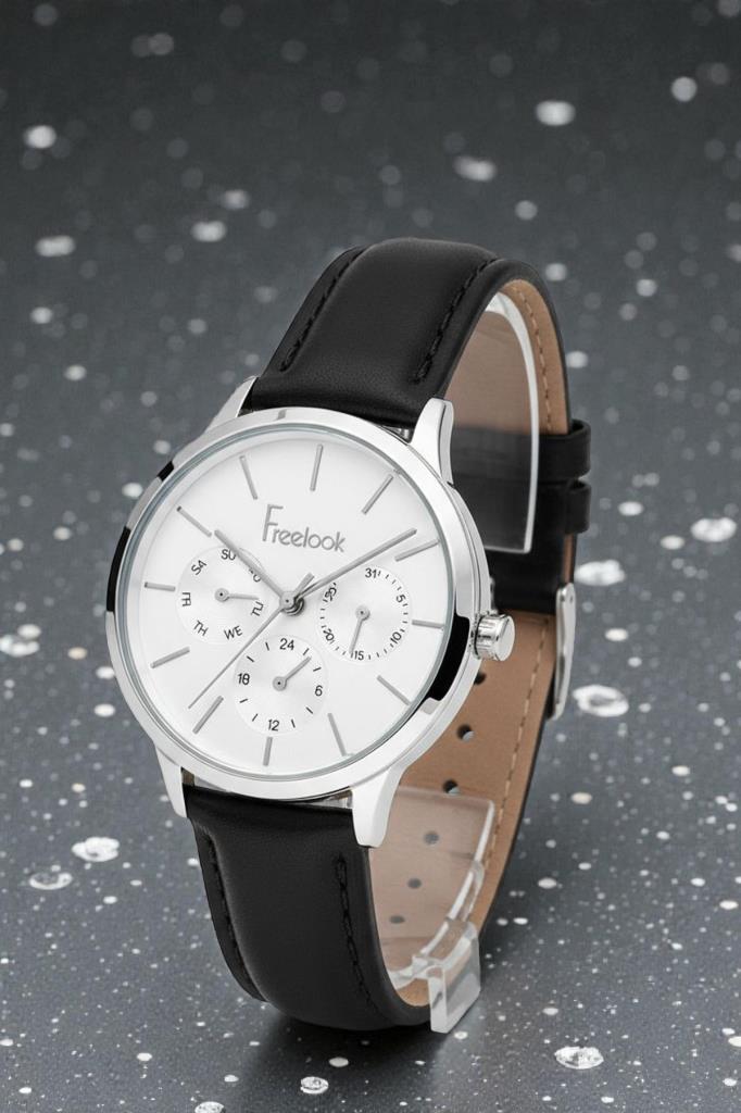 Freelook Siyah Deri Kayışlı Fonksiyonlu Kadın Kol Saati, Taşlı Bileklik Hediyeli