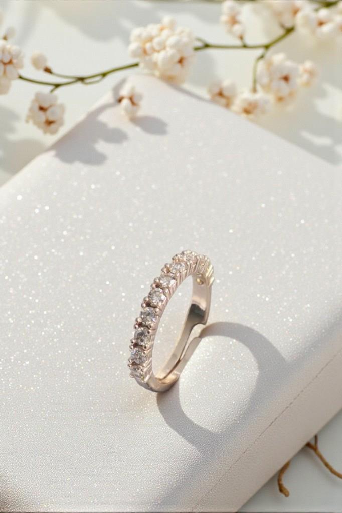 Zarif taş dizilimi ve altın tonlu ince formu ile tasarlanan bu şık yüzük, sade ama etkileyici bir stil arayanlar için ideal bir aksesuardır. Yüzük çevresine sıralanan parlak taşlar, ışığı güçlü şekilde yansıtarak parmakta zarif ve ışıltılı bir görünüm sunar.