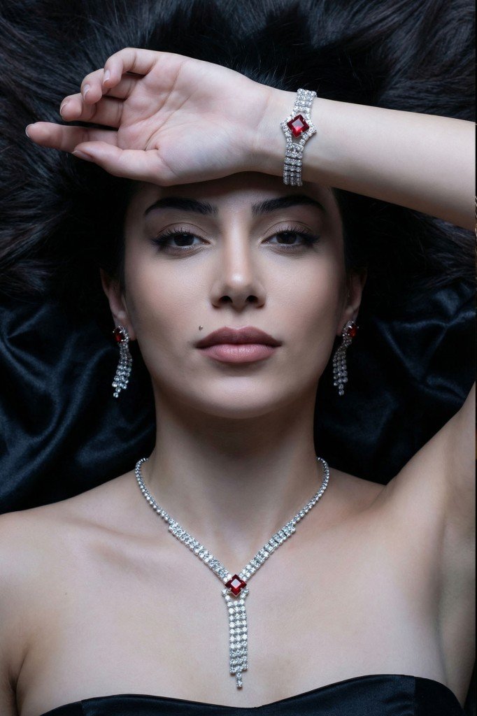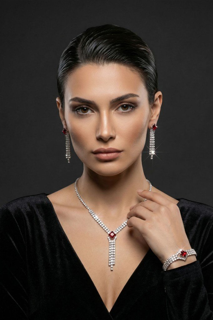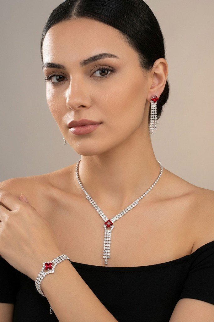 Kırmızı Kare Taşlı Su Yolu 3’lü Kolye, Küpe ve Bileklik Takı Seti - Düğün, Kına, Nişan Gelin Takı Seti