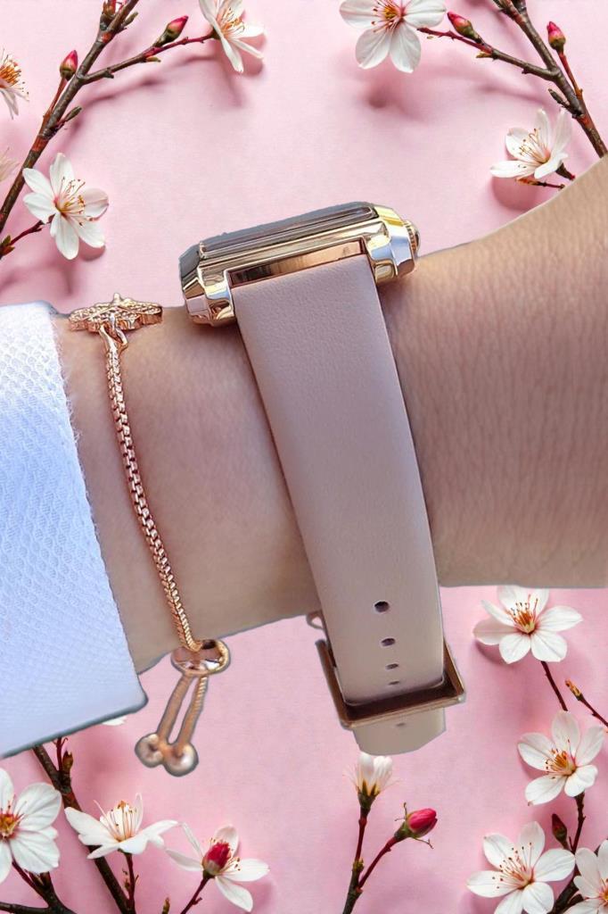 Pudra Deri Kayışlı Rose Gold Dikdörtgen Kasa Kadın Kol Saati, Taşlı Bileklik Hediyeli
