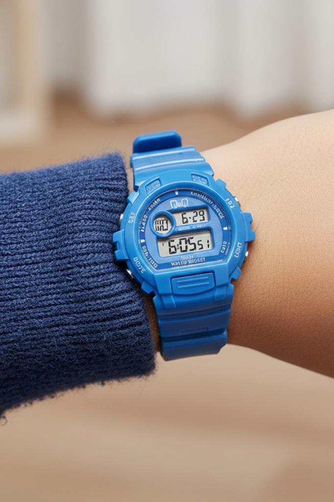 Q&Q mavi dijital saat, enerjisini rengiyle ilk bakışta hissettiren, fonksiyonlarıyla günün temposuna ayak uyduran bir tasarım sunar. Canlı mavi kasa ve kordonu, dinamizmi ve hareketi simgelerken; gri dijital ekranı net ve kolay okunur bir kullanım sağlar.