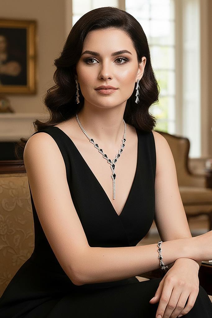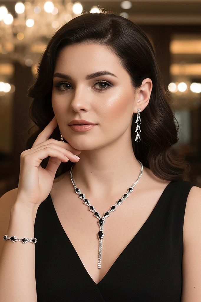 Gece şıklığını bir adım ileri taşıyan bu siyah damla taşlı 3’lü takı seti, gümüş renk gövdesi ve göz alıcı kristal taşlarıyla bulunduğunuz her ortamda dikkat çekmek için tasarlandı. Su yolu formundaki taş dizilimi, ışığı kusursuz yansıtarak pırlanta etkisi yaratır; damla kesim siyah taşlar ise sete asil ve modern bir karakter kazandırır.