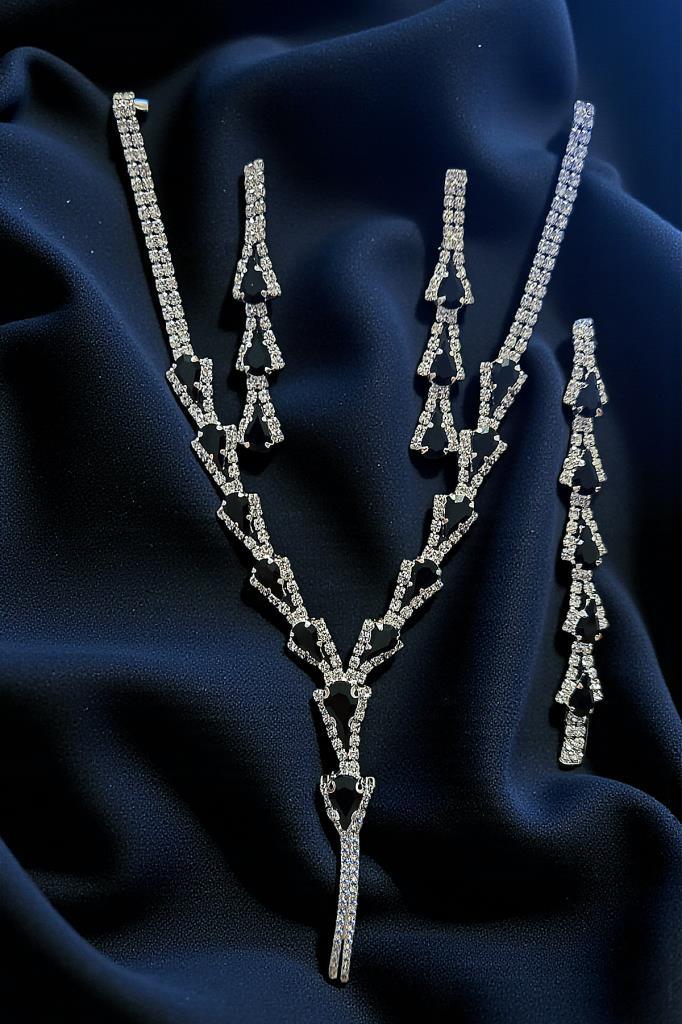 Siyah Damla Taşlı Taşlı 3’lü Kolye, Küpe ve Bileklik Seti - Düğün, Kına, Nişan Gelin Takı Seti