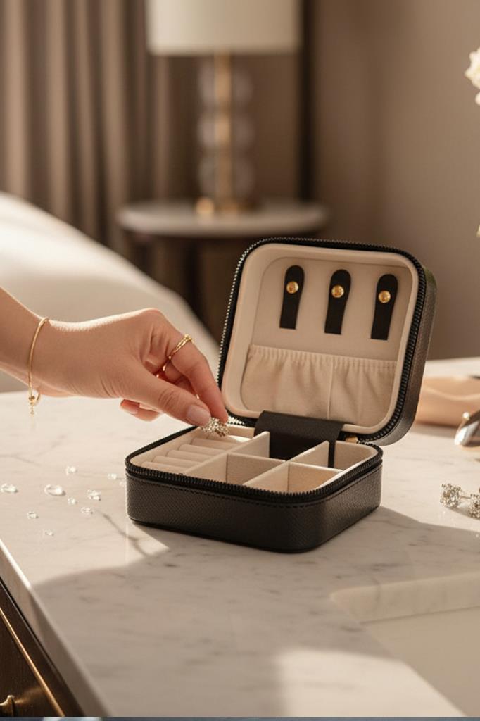 Deri Seyahat Takı Çantası, tatil ve seyahatlerde takılarınızı güvenle, düzenli ve şık bir şekilde taşımak için özel olarak tasarlanmıştır. Zarif deri kaplama dış yüzeyi, yumuşak kadife iç astarı ve kompakt ama yüksek kapasiteli yapısı sayesinde hem estetik hem de işlevsel bir kullanım sunar.