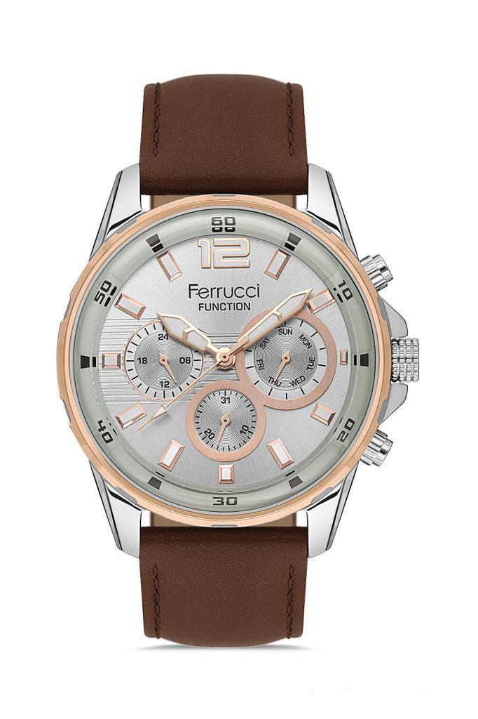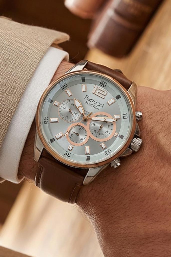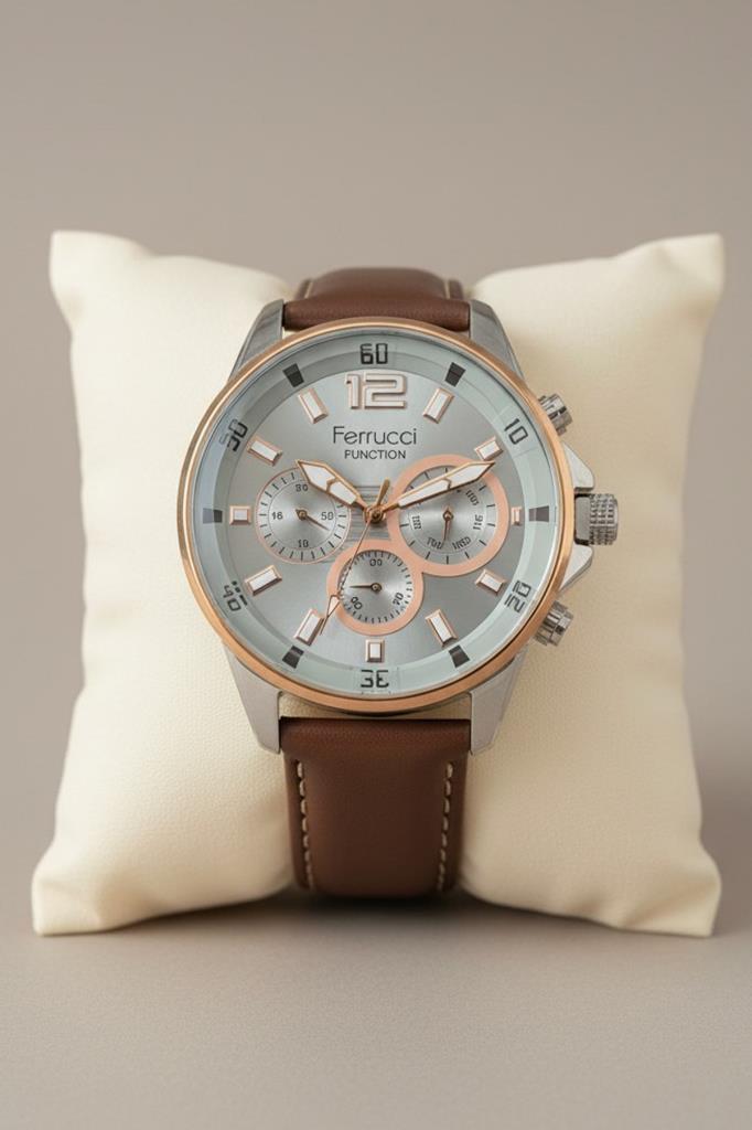 Klasik ve modern detayları bir araya getiren bu 45 mm erkek kol saati, şık tasarımı ve fonksiyonel yapısıyla günlük kullanım için ideal bir modeldir. Açık tonlu kadranı ve rose gold detayları saate zarif ve dikkat çekici bir görünüm kazandırırken, kahverengi deri kordon klasik bir stil sunar. Hem iş hayatında hem de günlük kombinlerde rahatlıkla kullanılabilecek şık bir aksesuardır.