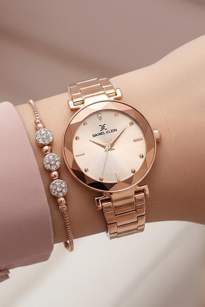 Rose gold tonlu bu Daniel Klein kadın kol saati, fasetli kasa tasarımı ve sade kadran yapısıyla bilekte sofistike bir duruş sergiler. Minimal çizgilerle tasarlanan kadranı, yumuşak geçişlere sahip kasa formu ve zarif metal kordonu ile hem günlük hem de özel kombinlere kolayca uyum sağlar.