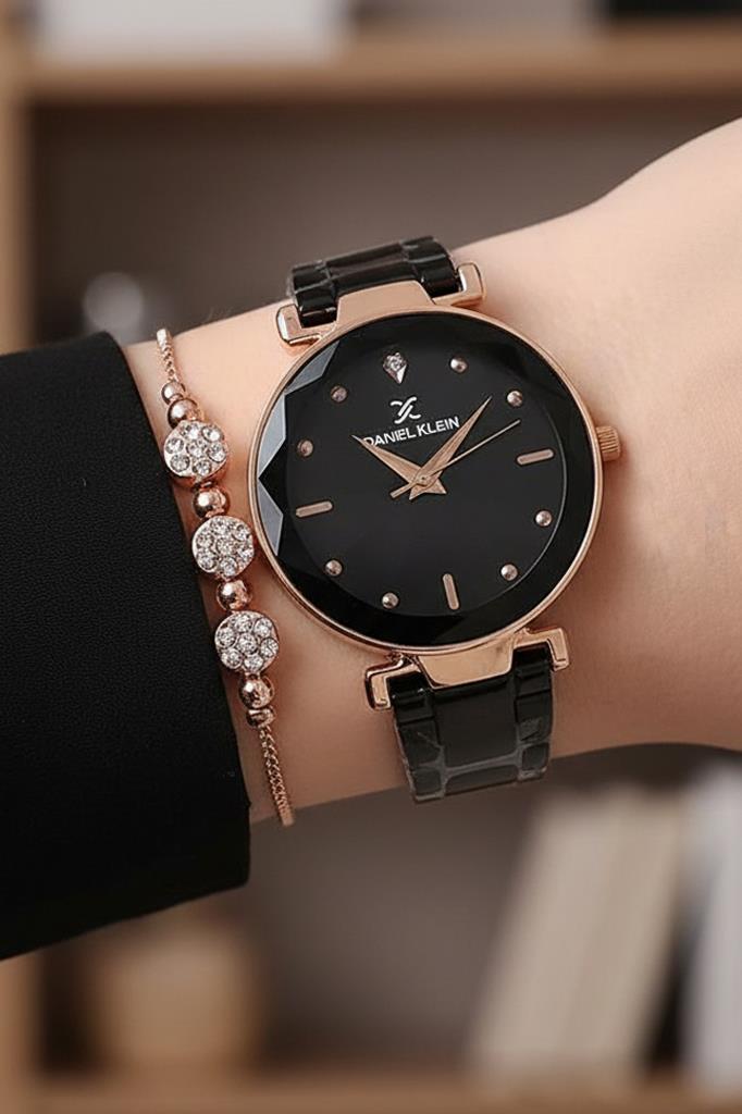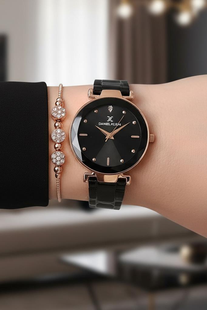 Daniel Klein siyah kadranlı kadın kol saati, derin siyahın asaleti ile rose gold detayların sıcak ışıltısını kusursuz bir dengede buluşturur. Kesme cam efektli kadranı, ışığı her açıdan farklı yansıtarak saate sofistike bir derinlik kazandırır. İlk bakışta sade, yaklaştıkça etkileyici…