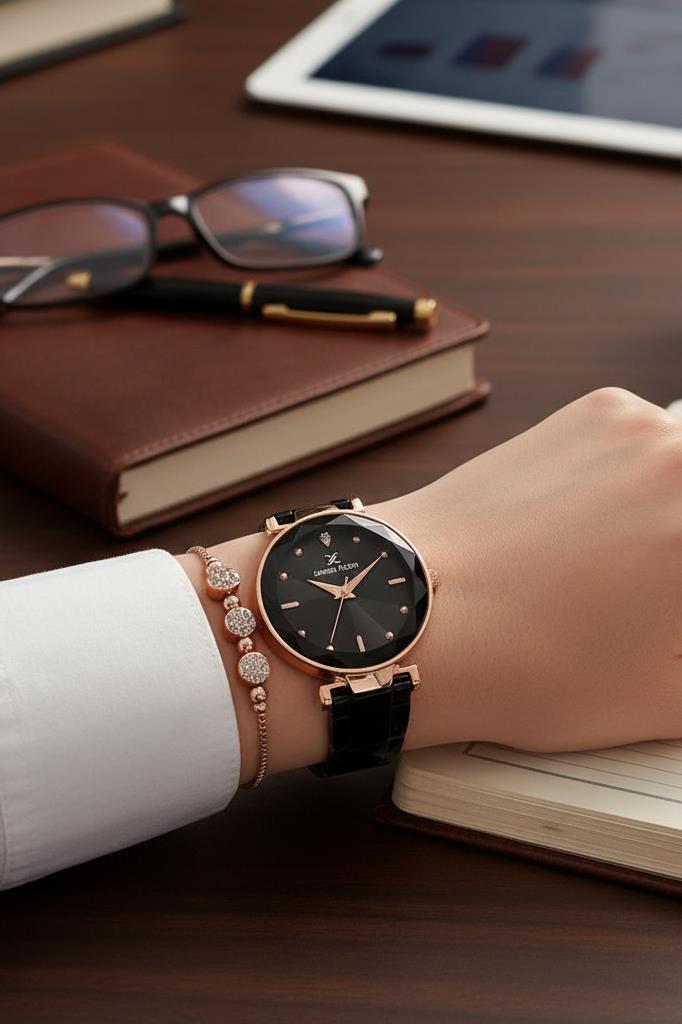 34 mm kasa çapı, bilekte zarif ama kendini hissettiren bir duruş sunar. Rose gold renkli metal kasa, siyah kadranla güçlü bir kontrast oluştururken; siyah kordonu saate modern ve iddialı bir karakter kazandırır. Günlük şıklıkta da, gece kombinlerinde de stilinizi tamamlayan güçlü bir parça olur.