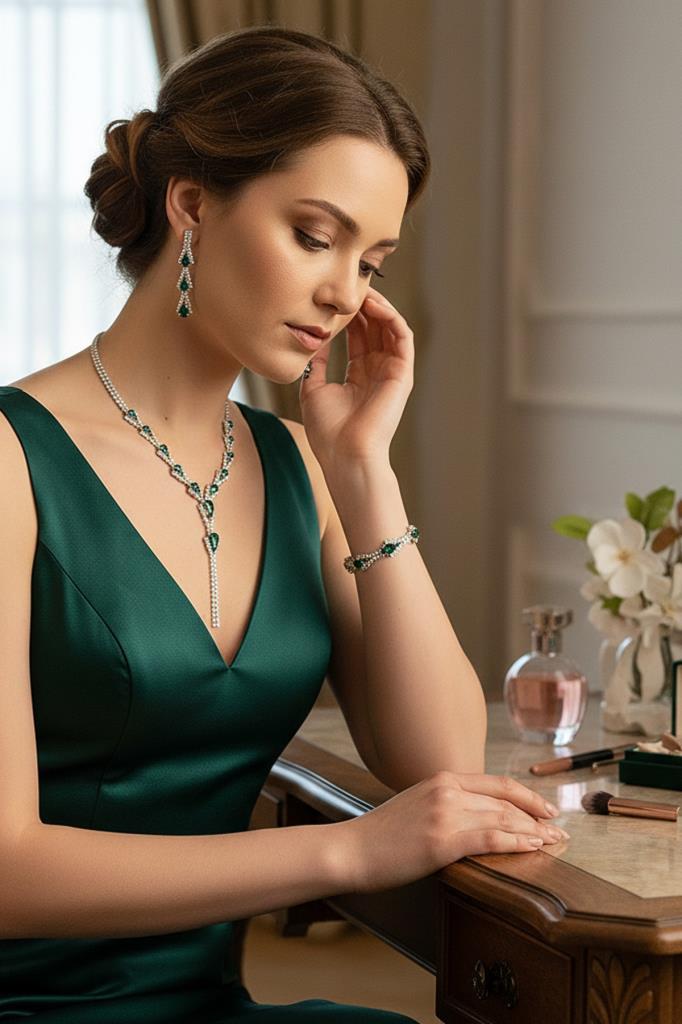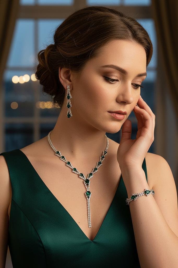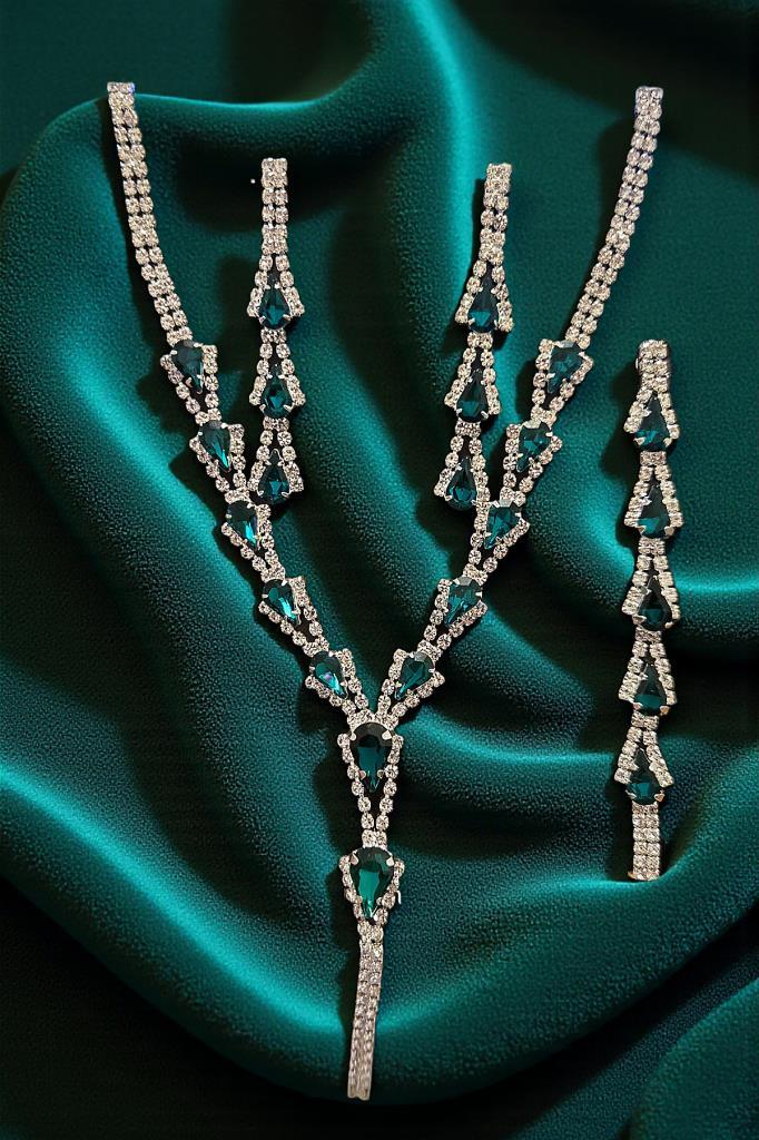 Gece şıklığını bir adım ileri taşıyan bu yeşil damla taşlı 3’lü takı seti, gümüş renk gövdesi ve göz alıcı kristal taşlarıyla bulunduğunuz her ortamda dikkat çekmek için tasarlandı. Su yolu formundaki taş dizilimi, ışığı kusursuz yansıtarak pırlanta etkisi yaratır; damla kesim yeşil taşlar ise sete asil ve modern bir karakter kazandırır.