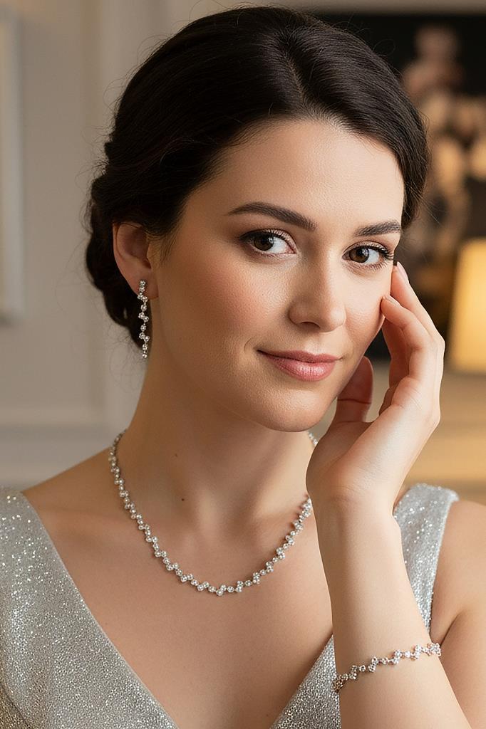 Setin yıldızı olan choker form Y kolye, boyun hattını belirgin şekilde vurgulayarak feminen bir duruş yaratır. Zigzag/Ajda modelin modern görünümü, klasik su yolu ışıltısıyla birleşerek hem iddialı hem zarif bir stil oluşturur. Küpe ve bileklik ile tamamlanan bu 3’lü kombin; düğün, nişan, söz, parti ve özel davetlerde şıklığınızı kusursuz biçimde tamamlar.