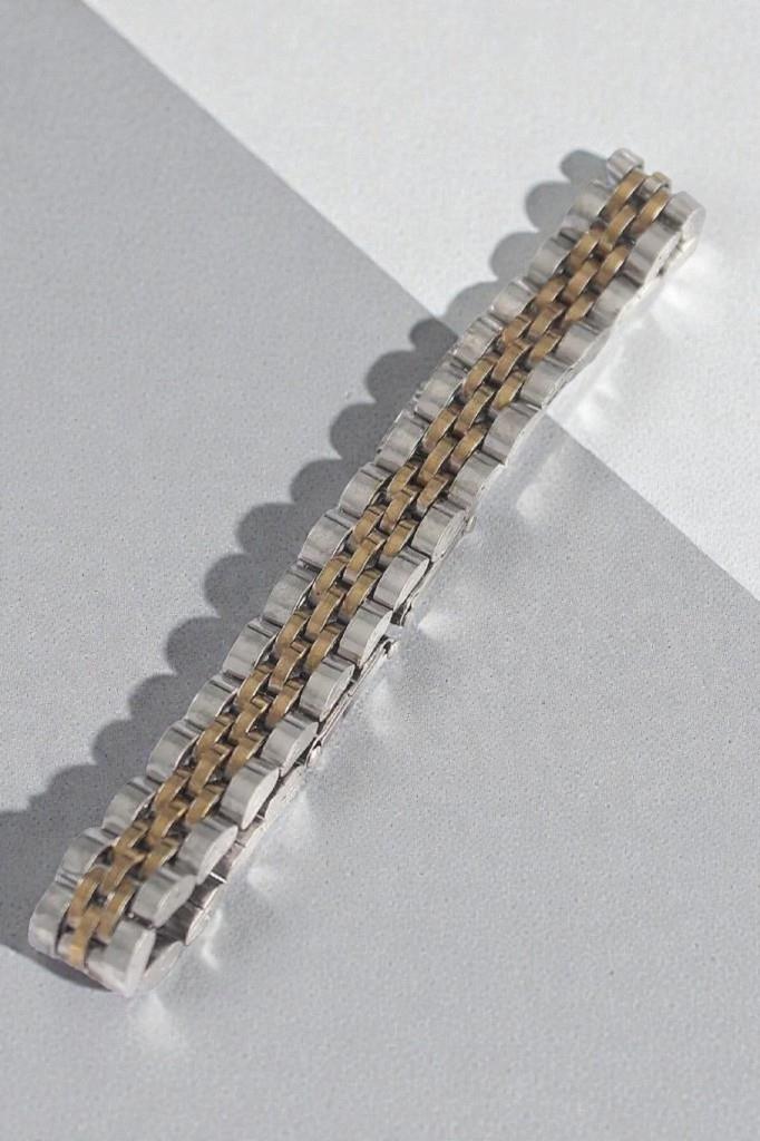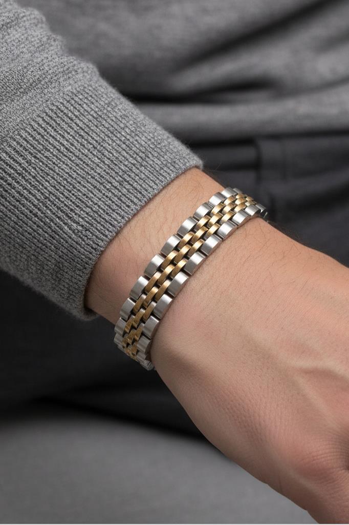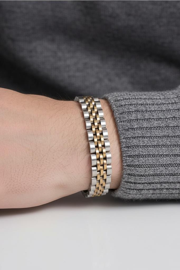 Bu çift renkli 316L çelik bileklik, dayanıklılığı ve modern tasarımı bir arada sunar. 316L paslanmaz çelik yapısı sayesinde kararma yapmaz, parlaklığını uzun süre korur ve günlük kullanıma son derece uygundur. Çelik ve altın tonlarının birleşimi, bileklikte maskülen ve premium bir görünüm yaratır.