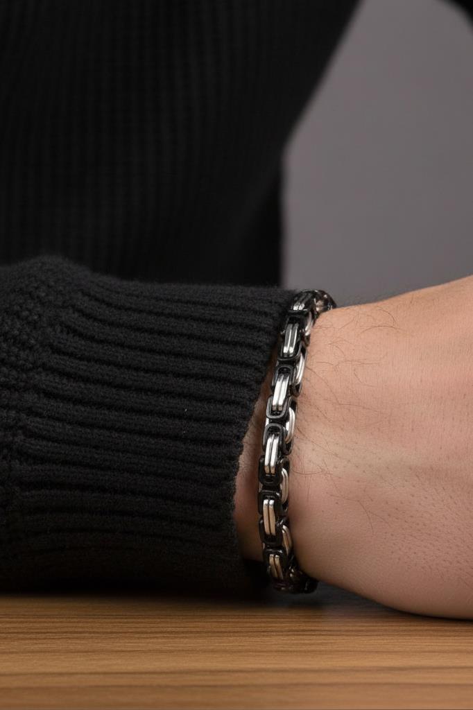 316L paslanmaz çelik erkek bileklik, siyah detaylı güçlü zincir formu ile net, sert ve maskülen bir stil sunar. Yüksek kalite 316L çelik yapısı sayesinde paslanma yapmaz, kararma göstermez ve uzun süreli kullanıma uygundur. Bilekte tok duruşu ile farkını ilk bakışta belli eder.
