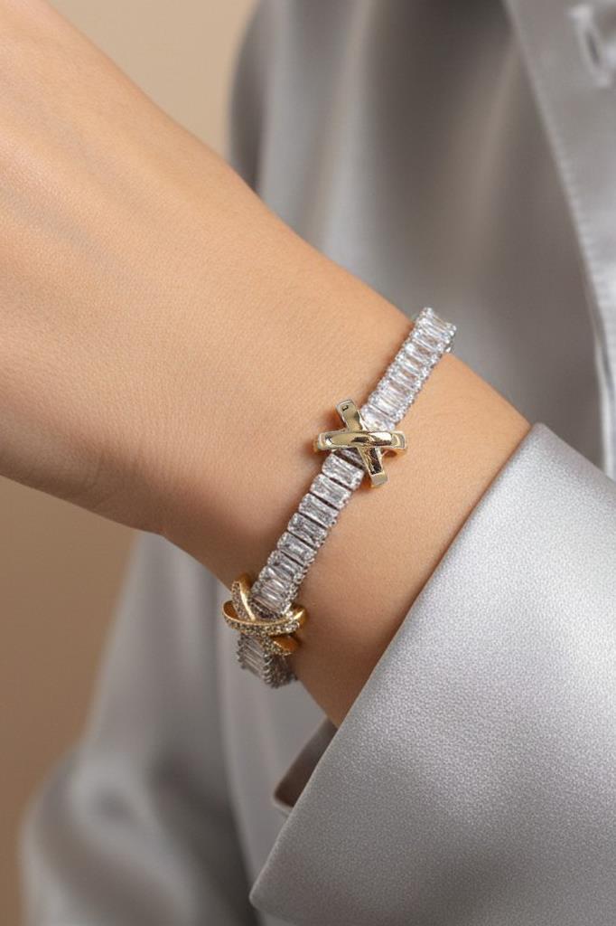 Işıltılı taş dizilimi ve zarif X (çapraz) form detayları ile öne çıkan bu şık bileklik, modern ve iddialı bir stil arayanlar için özel olarak tasarlanmıştır. Bileklik boyunca sıralanan parlak taşlar, ışığı güçlü bir şekilde yansıtarak bilekte dikkat çekici bir görünüm sunar.