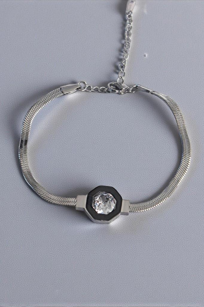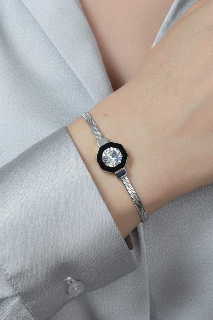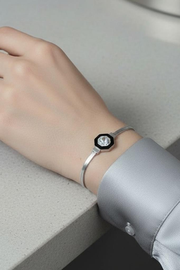 Minimal çizgileri ve merkezde yer alan tek taş görünümlü parlak detay ile öne çıkan bu zarif bileklik, sade şıklığı sevenler için özel olarak tasarlanmıştır. İnce zincir formu ve geometrik çerçeve içerisinde konumlandırılmış taş detayı, bileklikte modern ve sofistike bir duruş sağlar.