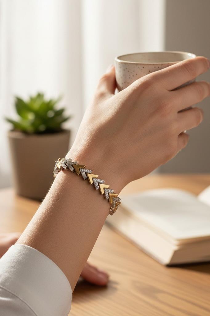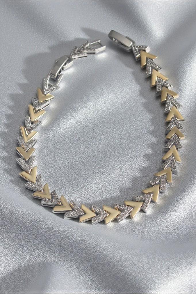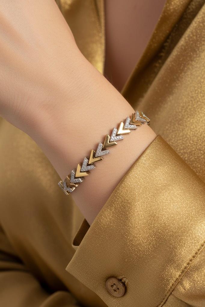 Modern çizgileri ve güçlü geometrik formu ile öne çıkan bu V desenli (chevron) taşlı bileklik, stilini net ve iddialı şekilde yansıtmak isteyenler için özel olarak tasarlanmıştır. Altın ve gümüş tonlarının bir arada kullanıldığı tasarım, bilekte hareketli ve dikkat çekici bir görünüm sunar.