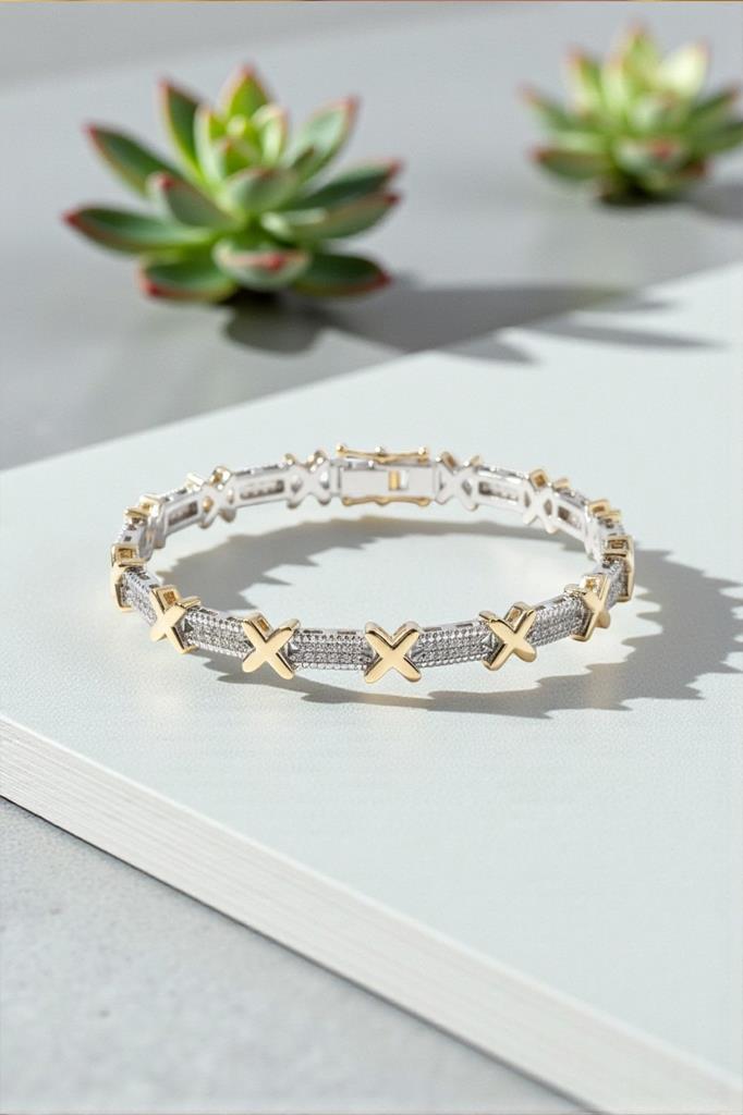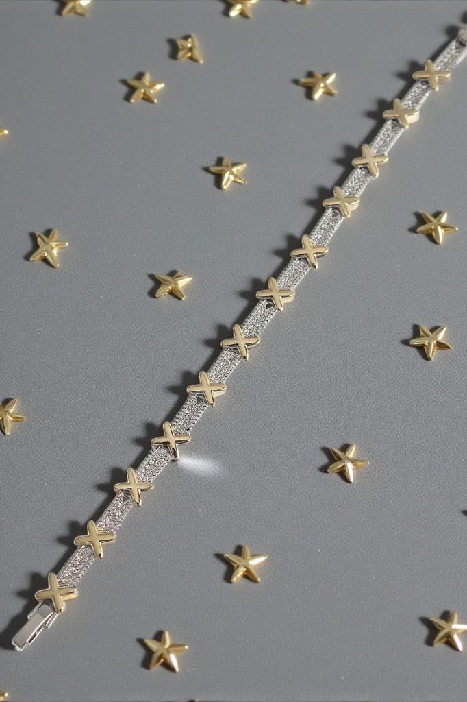 Zarif detayları ve modern tasarımıyla öne çıkan bu X figürlü taşlı bileklik, sade şıklığı sevenler için özel olarak tasarlanmıştır. Altın tonlu X figürleri ve taşlı yapısı, bilekte ince ama dikkat çekici bir ışıltı sunar.