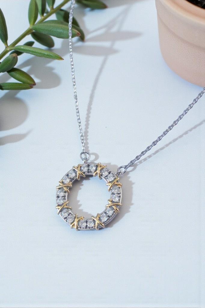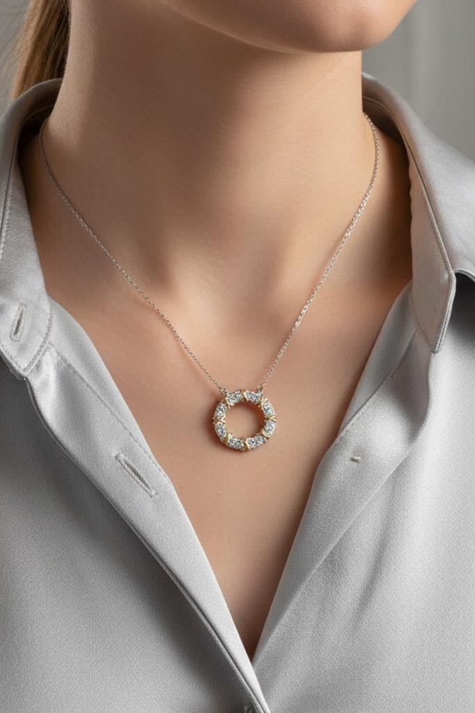Zamansız tasarımı ve anlam yüklü formuyla öne çıkan bu halka taşlı çelik kolye, zarafeti sembolik bir şıklıkla buluşturur. Dairesel form; sonsuzluk, bütünlük ve sürekliliği temsil ederken, çevresini saran parlak taşlar kolyeye sofistike bir ışıltı kazandırır. Altın tonlu zarif detaylar tasarıma modern bir kontrast ekler.
