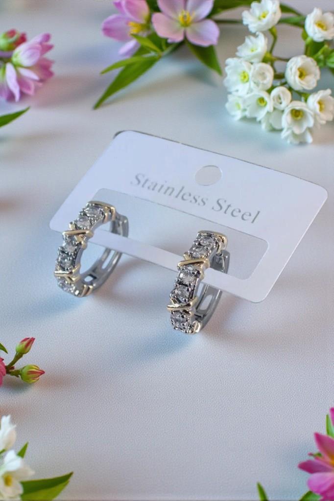 Modern halka formu ve taş detaylarıyla öne çıkan bu çelik küpe modeli, sade şıklığı güçlü bir tasarımla birleştirir. Parlak taşlarla zenginleştirilen yüzeyi, küpelere zarif bir ışıltı kazandırırken altın tonlu detaylar modern bir kontrast oluşturur.