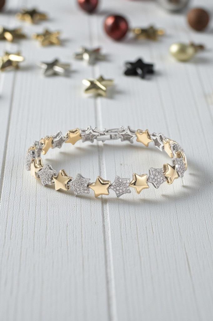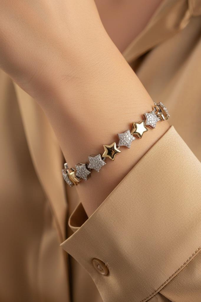 Şıklığı ve zarif detaylarıyla öne çıkan bu yıldız figürlü taşlı bileklik, günlük kombinlere ışıltılı bir dokunuş katmak isteyenler için özel olarak tasarlanmıştır. Altın ve gümüş tonlarının uyumlu birleşimi, bilek üzerinde modern ve feminen bir görünüm sunar.