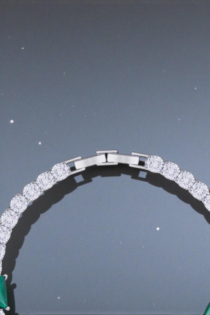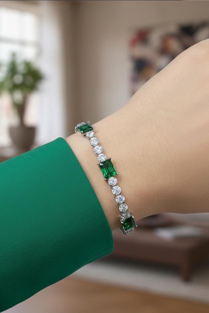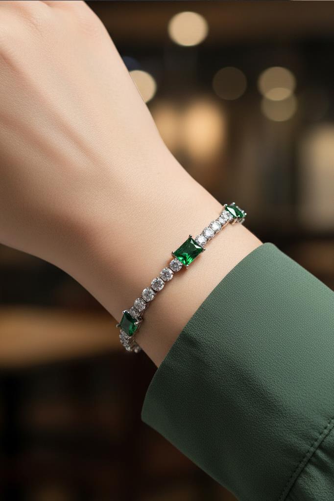 Hem günlük kombinlerde zarif bir tamamlayıcı olarak kullanılabilir hem de özel davetlerde tek başına öne çıkan şık bir aksesuar görevi görür. Yeşil taşların kattığı renkli dokunuş, klasik tenis bilekliklere modern ve sofistike bir hava kazandırır.
